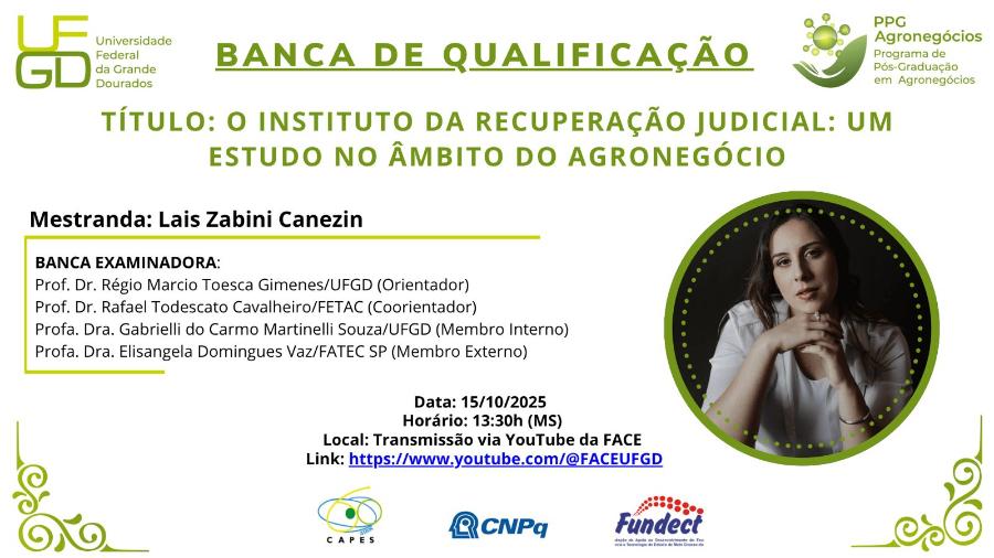 O Mestrado em Agronegócios da UFGD convida você para uma defesa de projeto que mergulha em um dos temas mais quentes e debatidos do direito e das finanças no agronegócio. Participe da apresentação da mestranda Lais Zabini Canezin.