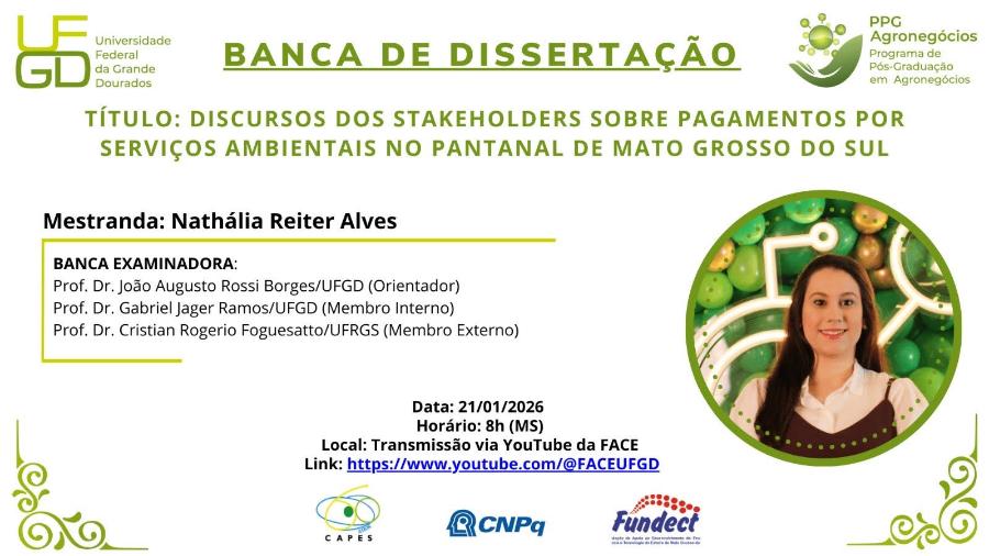 Como alinhar a produção agropecuária com a conservação de um dos ecossistemas mais vibrantes do planeta? A resposta pode estar na forma como as pessoas que vivem e trabalham na região percebem os incentivos econômicos. No dia 21 de janeiro, o Programa de Pós-Graduação em Agronegócios da UFGD convida toda a comunidade para a defesa de dissertação da mestranda Nathália Reiter Alves.
