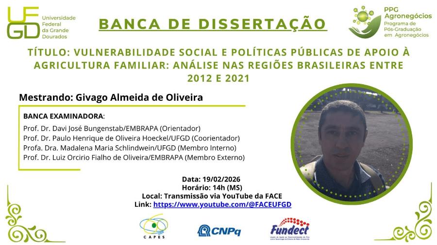 No próximo dia 19 de fevereiro, o Programa de Pós-Graduação em Agronegócios da UFGD convida toda a comunidade para a defesa de dissertação do mestrando Givago Almeida de Oliveira.
